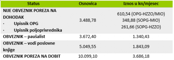 Osobe koje su upisane u Upisnik OPG-ova i kojima je to jedino ili glavno zanimanje obveznici su mirovinskog i zdravstvenog osiguranja sukladno posebnim propisima kojima se uređuju ta dva osiguranja. Osobe kojima je poljoprivreda primarno zanimanje, dužni su plaćati doprinose za mirovinsko i zdravstveno osiguranje. Iznos mjesečnih doprinosa za 2021. godinu prikazan je u sljedećoj tablici.