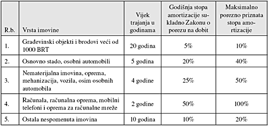 Zakon o porezu na dobit utvrđuje porezno priznatu metodu amortizacije (linearnu metodu) kao i godišnje amortizacijske stope, s time da se godišnje amortizacijske stope mogu podvostručiti. Pregled amortizacijskih stopa za pojedine grupe dugotrajne imovine dan je u sljedećoj tablici…