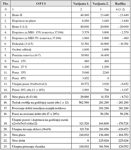 Temeljem prikazanih podataka proizlazi da će ukupna primanja vlasnika društva u jednoj godini biti za 120.552 kune veća ako umjesto bruto-plaće od 40 tisuća kuna ugovori bruto-plaću od 20 tisuća kuna. Iskazana razlika rezultat je značajno manjeg poreznog opterećenja za ostvarenu dobit (stopa iznosi 20 posto) u odnosu na propisana davanja za dohodak od nesamostalnog rada, odnosno plaću.