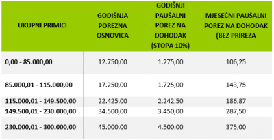 Porezna uprava obvezniku izdaje Rješenje kojim utvrđuje svotu godišnjeg paušalnog dohotka, godišnju i mjesečnu svotu poreza na dohodak i prireza porezu ako je propisan. Porezna stopa za paušalni porez na dohodak iznosi 10 %. Prikaz godišnjeg paušalnog poreza na dohodak prikazan je u sljedećoj tablici.