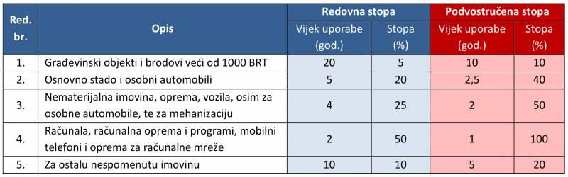 Visina porezno dopuštenih stopa amortizacije propisana je Zakonom o porezu na dobit (čl. 12. st. 5.), dok je odredbama čl. 12. st. 6. Zakona o porezu na dobit dozvoljena i primjena podvostručenih stopa amortizacije.