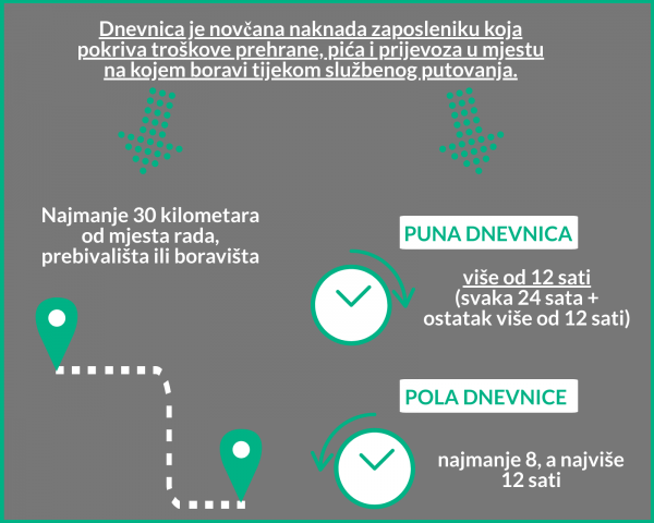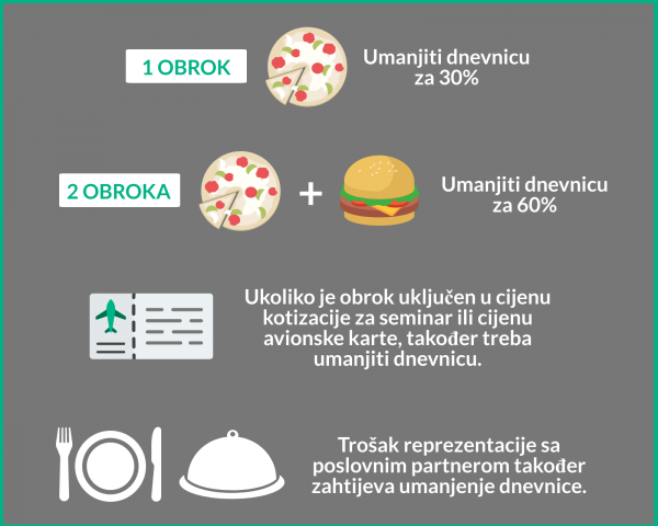 Dakle, dnevnica je novac namijenjen zaposleniku za potrebe hrane, pića i prijevoza u mjestu na koje je poslan službenim putovanjem. Ako mu poslodavac osigura ručak ili večeru, logično je da se iznos dnevnice umanji. Stoga, ako je poslodavca osigurao jedan obrok, što može biti ručak ili večera, iznos dnevnice se umanjuje za 30 posto. Ako je osigurao dva obroka, dnevnica će se umanjiti za 60 posto.