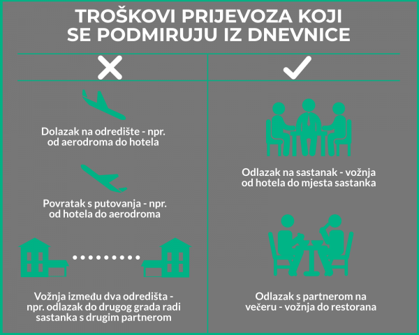 Kako to izgleda u praksi? Recimo da zaposlenik putuje avionom na službeni put. Po dolasku na odredište uzima taksi od zračne luke na do hotela u kojem će biti smješten. Obzirom da je riječ o prvom dolasku na odredište, trošak prijevoza taksijem se ne podmiruje iz dnevnice. Nakon dolaska u hotel uzima taksi kako bi došao na mjesto održavanja poslovne konferencije.