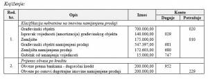 3.) Na datum klasifikacije nekretnine na dugotrajnu imovinu namijenjenu prodaji fer vrijednost nekretnine iznosi 730.000 (zemljište 175.000 kn, a građevinski objekt 555.000 kn), a troškovi prodaje 10.000 kn. Buduća da je knjigovodstvena vrijednost manja od fer vrijednosti umanjene za troškove prodaje (735.000 kn < 720.000 kn), nekretnina će se klasificirati na imovinu namijenjenu prodaji po fer vrijednosti. Društvo priznaje ukupni gubitak od umanjenja u iznosu od 15.000 kn. Prestaje daljnji obračun amortizacije.