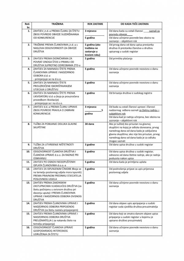Zastarni rokovi prema Zakonu o trgovačkim društvima (Nar.nov., br. 111/93., 34/99., 121/99. – vjerodostojno tumačenje, 52/00., 118/03., 107/07., 146/08., 37/09., 125/11., 152/11. – proč.tekst., 111/12., 68/13., 110/15., 110/15. i 40/19.).