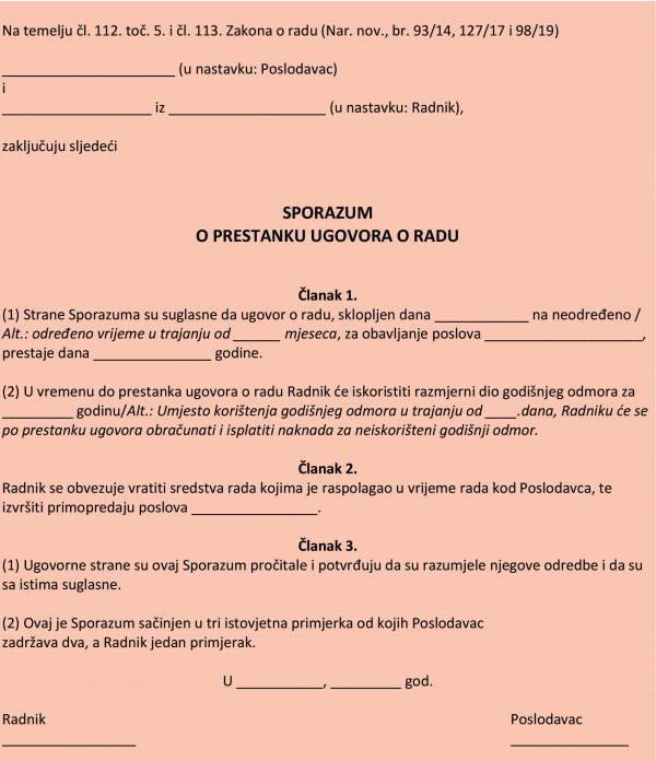Primjer Sporazuma o prestanku ugovora o radu